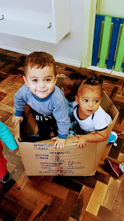 Atividade desenvolvida com caixas de papelão, onde cada criança explora sua caixa, interagindo com o colega e usando sua imaginação!